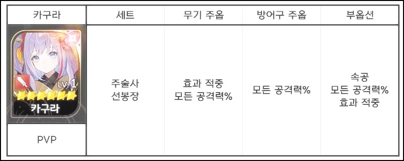 장비는 주술사 또는 선봉장 세트를 추천합니다. 불굴을 믿고 공격력과 효과 적중, 그리고 선공을 잡기 위한 속공에 집중하는 세팅입니다.
